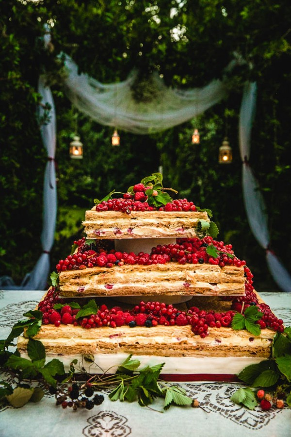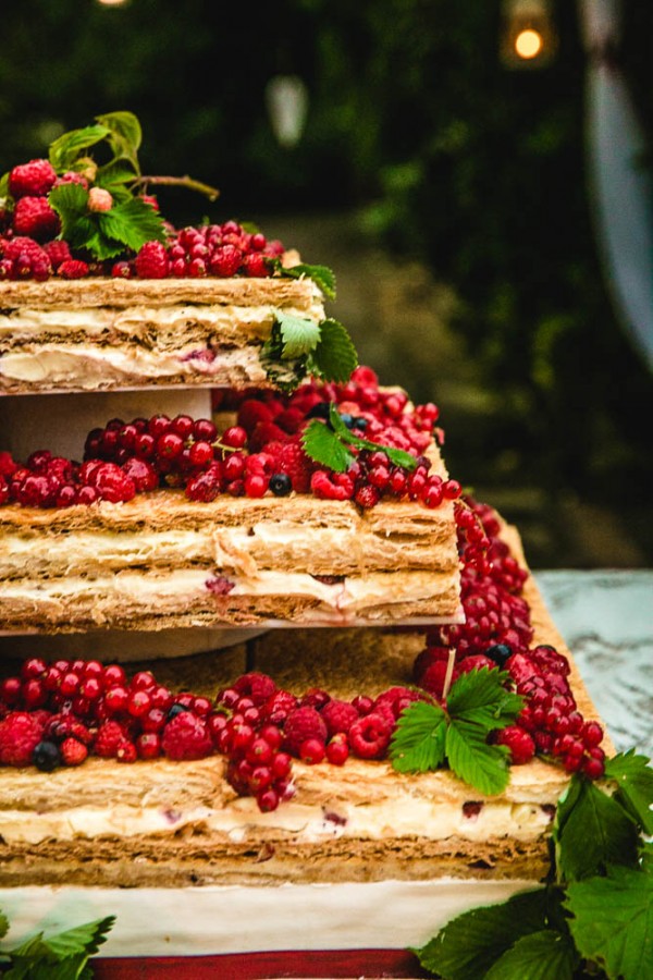A torta italiana típica para o casamento é feita com massa folhada, recheada com creme de confeiteiro e coberta por uma camada de açúcar de confeiteiro. O que a torna mais especial é que ela é montada em frente aos convidados, na hora da festa, proporcionando uma experiência totalmente diferente do momento da torta, para ninguém esquecer! Um “show” de confeitaria! E os convidados assistem animados à cada etapa da montagem da torta nuziale, batendo palmas e cantando em voz alta Nel blu dipinto di blu (depois um grupo puxou Piú Bella Cosa, do Eros Ramazzotti). É demais, porque sempre é espontâneo e animador, todo mundo se envolve, canta sem vergonha de ser ridiculo feliz, sabe? Pra mim, que tive a oportunidade de assistir a uma montagem do mil folhas ao vivo foi um dos momentos mais legais do casamento!!
