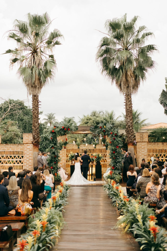 Muitas vezes os casamentos Boho são feitos ao ar livre e apresentam muitas vezes um altar um arco para a cerimônia. Estes elementos são importantes para conferir um ambiente agradável e a realização dos mesmos podem ser DIY ou recorrendo a especialistas da decoração.? flores conferem um resultado visual deslumbrante. Pode ir mais longe e misturar estes elementos com madeira, folhas tropicais, cactus e suculentas. Se tiver jeito, pode fazê-los em DIY